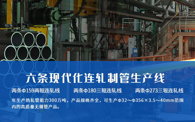 公司有Φ180三輥連軋線兩條,Φ273三輥連軋線兩條,產品規格齊全,可生產Φ32~Φ356×3.5~40mm范圍內的高質量無縫管產品。